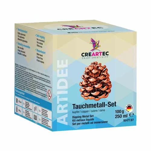 ARTIDEE CREARTEC Dipping Metal is a thin, easy-flowing metal dispersion, mixed with micro-fine brass, copper or silver particles. You can dip objects directly into the dipping medium or alternatively apply the medium with a brush in many layers. It dries solid within 40 – 60 minutes and immediately shows its metallic appearance.