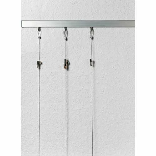 Ordering information: to install a 2m Asre Silver Studio Picture Rail you also need to order: 5 brass securing clips (item code 81002), 5 rawlplugs and screws, 2 end caps (item code 81201), nylon or steel cords depending on the number of pictures to be hung, metal slide hooks depending on the number of cords (1 per cord, item code 81004), picture hooks depending on the number of pictures (2 per picture, item code 81006) and a rail connector (if using more than one rail, plus multiples of the above if so).