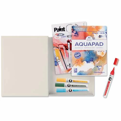 Aquapads contain 10 sheets of pH-neutral white watercolour paper. The paper is 300gsm, 100% cellulose, acid-free. Molotow Aqua Brush markers have fast-drying, odourless ink based on food colouring