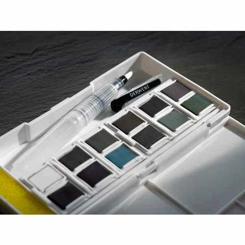 This Derwent Tinted Charcoal Paint Pan Set is portable and perfect for travelling or outdoor use. It contains 12 water-soluble tinted charcoal paints, a mini waterbrush, a sponge and 5 mixing palettes.