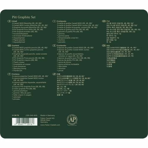 The Faber-Castell Pitt 19 Piece Graphite Set is a selected assortment of Castell 9000, Castell 9000 Jumbo and other graphite pencils and chalks. It is ideal for for creative beginners and professionals.