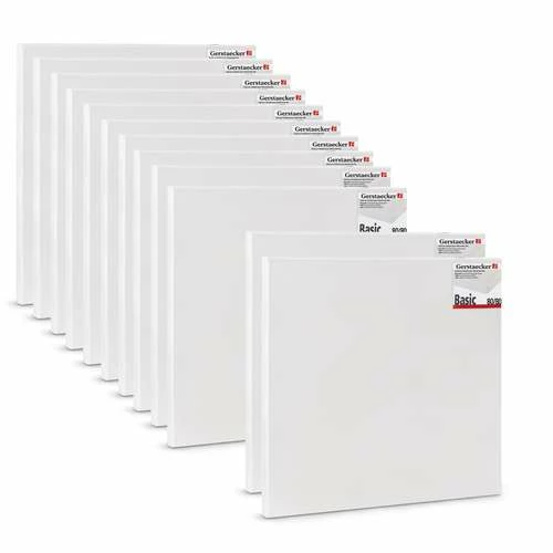 The canvases in this Gerstaecker Basic Canvas Pack of 12 measure 80 x 80cm and have a stabilising cross on the back. For further multipacks please see item code 85477.