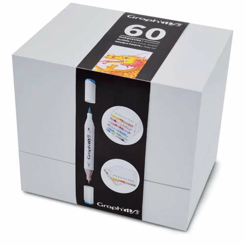 This Graph’It Brush Marker Set contains 60 double ended markers in an elegant recyclable and biodegradable white cardboard organiser box. It is a great gift for students or experienced artists, professionals, hobbyists or manga fans.