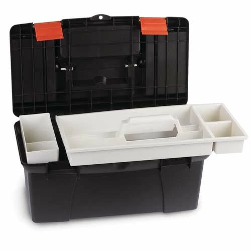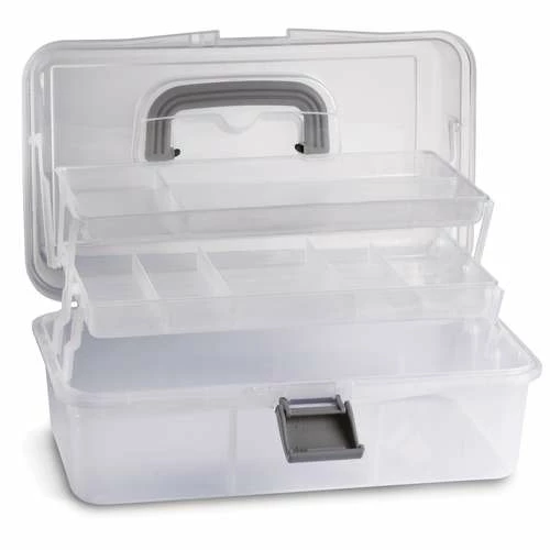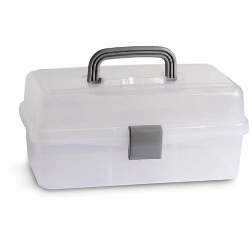 - 44721 = transparent, with a grey handle and clasp. It is a toolbox style with 2 cantilever trays.