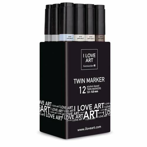 These I Love Art Twin Marker Grey Tones Sets contain 12 marker pens. I Love Art Twin Markers have 2 different tips: a 1 mm fine point and a 2-6 mm chisel tip. They are ideal for sketching, drawing and illustration.