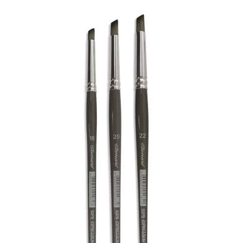 Léonard Series 50PB Synthetic Expression Brushes have grey handles with seamless silver ferrules. The Léonard Series 50PB Synthetic Expression Brush Set contains 3 chisel tipped brushes in sizes 18, 20 and 22.