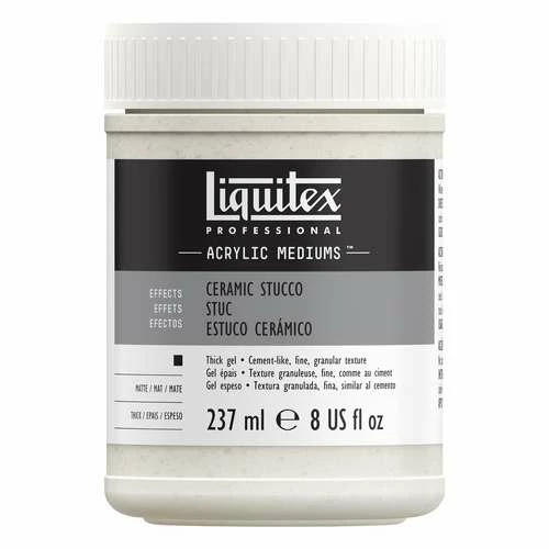 Liquitex ceramic stucco, nontoxic, water-resistant, non-yellowing, with medium viscosity, and drying to a light grey, matt stucco finish.