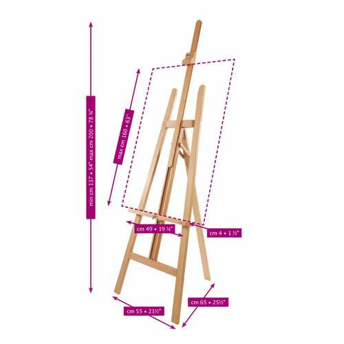Mabef M13 AL easel, in oiled beech wood, measuring 55cmx65cmx65cm at the base, with adjustable height up to 2m, rust-proof aluminium screws and a 49cmx4cm shelf, weighing 5.5kg, and suitable for canvases up to 1.6m high and 10kg in weight.