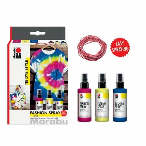 This Marabu Fashion Spray Tie Dye Style Set contains 3 textile spray paints for transforming T-shirts and other textiles into unique favorites. Create circles, spirals and stripes at will!