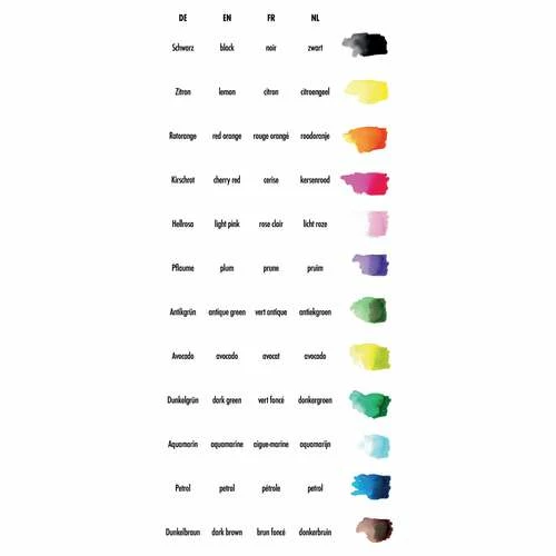 The Marabu Mega Mash Aqua Pen Set contains the following colours: