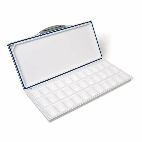 Mijello Fusion Watercolour Box Palettes are made of durable plastic with blue lids. There is a large removable mixing well in the lid which is easy to clean, and the lid itself can also be used for mixing. Mijello Fusion Watercolour Box Palettes are available in different sizes and formats.