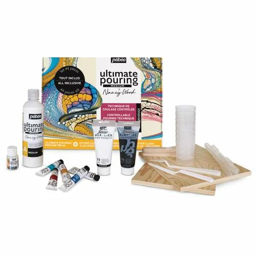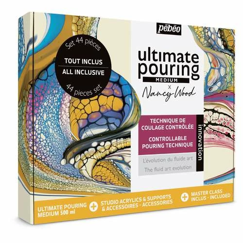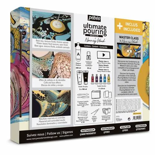 The 44-piece Pébéo Ultimate Pouring Medium ‘Nancy Wood’ Set contains everything you need to start pouring impressive works straight away: the 2-component medium, acrylic paint and accessories. In addition, in the set you will receive an access code to a video by Nancy Wood, which introduces you step by step to the basics of the Ultimate Pouring Medium technique and accompanies you in your creations. (Languages: English, French, Spanish)