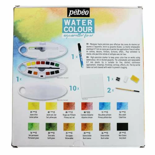 Pébéo Watercolour Travel Sets consist of 12 or 24 x 1/2 pans of fine watercolour, plus all the accessories needed on field trips.