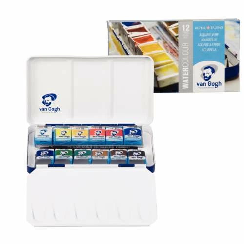 Royal Talens Van Gogh watercolour metal box sets, containing 12 or 24 half-pans of intermixable, lightfast, bright watercolour paints, with no heavy metals, as well as size 3 or size 6 synthetic hair brushes.