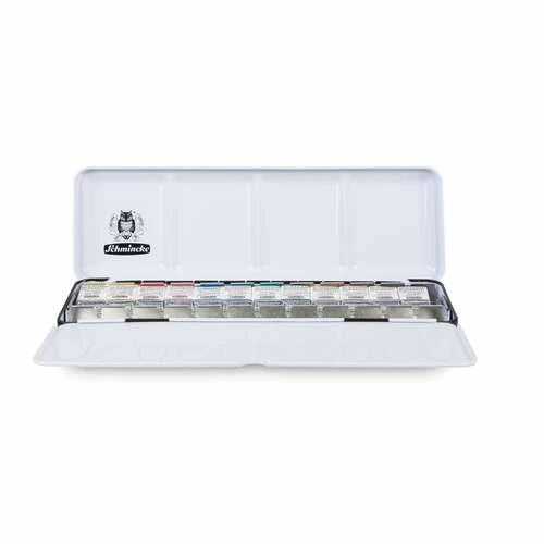 The 12 half-pan set contains: lemon yellow, cadmium yellow, cadmium red light, permanent carmine, ultramarine finest, Prussian blue, phthalo green, permanent olive green, yellow ochre, English venetian red, sepia brown and ivory black.