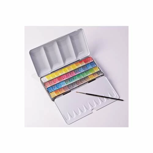 31338 contains 48 x 1/2 pans in the 24 colours above plus: 116 titanium white, 202 burnt umber, 208 natural sienna, 257 gold ochre, 302 cerulean blue, 308 indigo blue, 309 cobalt blue deep, 312 ultramarine blue light, 395 indanthrene blue, 407 van Dyck brown, 445 brown pink , 561 paint yellow, 574 primary yellow, 579 Sennelier yellow deep, 587 Sophie yellow, 640 Saturn red, 641 Sennelier orange, 680 permanent magenta, 807 English dark green, 809 Hookers green, 817 Sennelier green, 847 Veronese green earth, 919 caput mortuum, 931 neutral.