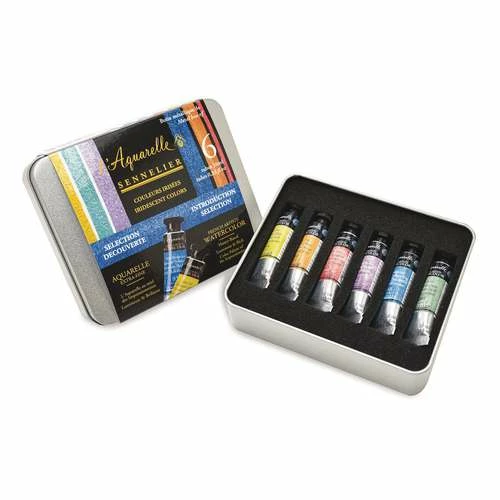 Sennelier Extra Fine Watercolour Iridescent Tube Sets contain assortments of these honey-based paints. The colours have a creamy, glossy texture and offer lively bright shades.