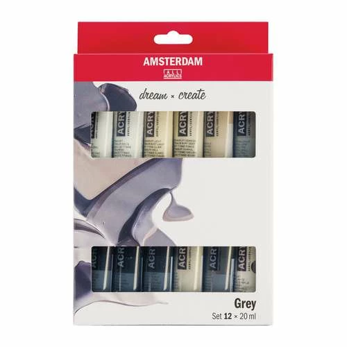 Talens Amsterdam Standard Series Acrylic Sets contain 12 x 20ml tubes of creamy acrylic paints made using 100% acrylic emulsion and high-quality pigments. The paint can be diluted with water and is waterproof when dry.