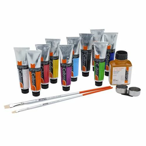 The Royal Talens Cobra Gift Box contains 10 x 40ml tubes of Talens oil colour, 1 x 75ml medium, 2 brushes, and assorted accessories.