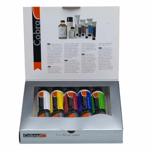 The Royal Talens Cobra 5-tube Water Mixable Oil Colour Set contains 10 x 40ml tubes of fast-drying oil colours, easy to mix and to wash off.