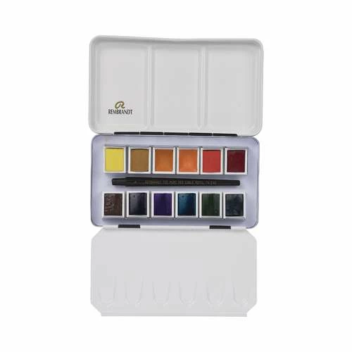 The metal watercolour box is presented in a beautiful cardboard case. It contains 12 pans of this popular artist’s watercolour paint by Rembrandt, plus a removable mixing palette and a high-quality red sable hair watercolour brush.