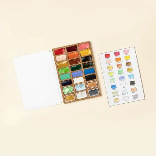 TIP: These watercolours are not in plastic cups in a tin but directly in a box made of recycled wine corks. This is not only environmentally friendly, it is also practical. Because this way, your paints are well protected when you work on the go. Moreover, it feels nice and looks cool!